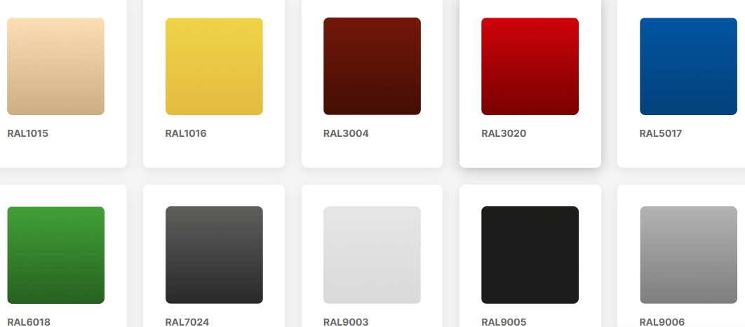 Модель выпускается в 10 стандартных цветовых решениях фронтальной панели по таблице RAL: 9003, 9005, 9006, 1015, 1016, 3004, 3020, 5017, 6018 и 7024.