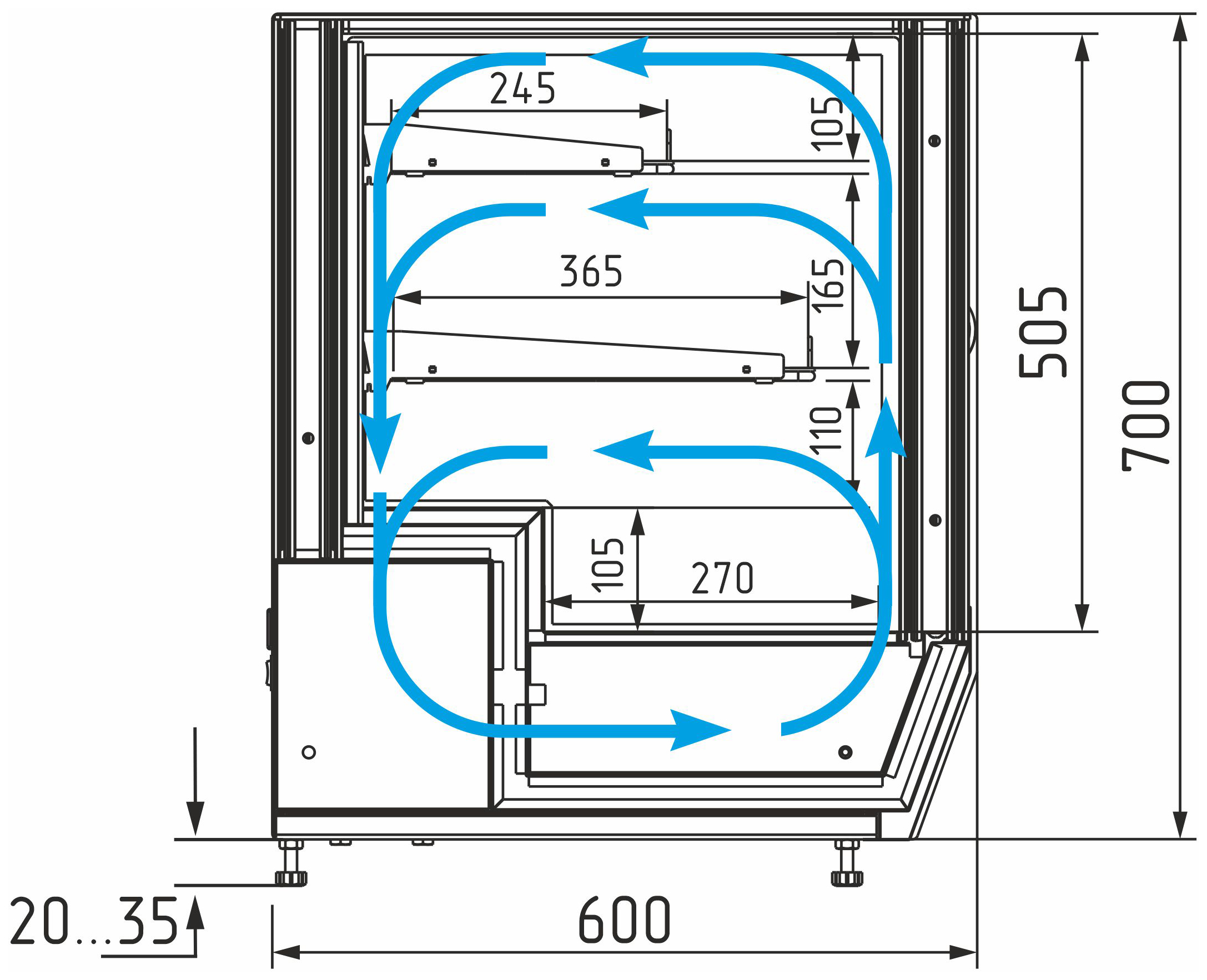 Максимальная высота выкладки продуктов: на нижнем поддоне — до 150 мм, на полках— до 100 мм.